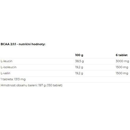 Az esszenciális elágazó láncú aminosavak, az L-leucin, az L-izoleucin és az L-valin (BCAA) tabletta formájában. A tabletták precíz és kényelmes adagolási formát jelentenek, és minden tabletta 1 g BCAA-t tartalmaz. Az esszenciális elágazó láncú aminosavak 2:1:1 arányban vannak jelen ebben a termékben az L-leucin esetében. Intenzív fizikai aktivitás során az egyes aminosavak, valamint más fontos anyagok is elvesznek. Az aminosavak minden fehérje építőkövei. A minőségi fehérje megfelelő bevitele, az optimális aminosav-tartomány mellett, hozzájárul az izomnövekedéshez. Az elágazó láncú aminosavak az esszenciális savak közé tartoznak, amelyeket a szervezetnek az étrenden keresztül kell megkapnia, mivel szintézisük más forrásból nem történik meg a szervezetben. 1000 mg BCAA tablettánként aminosav arány - 2:1:1 A BCAA 2:1:1 a következőkre szolgál: a fizikai megterhelés utáni regenerálódás javítása, az izomtömeg védelme, valamint a sportolók minőségi táplálkozásának kiegészítőjeként. Összetevők: L-Leucin, L-Izoleucin, L-Valin, tömegnövelő szer: mikrokristályos cellulóz, csomósodást gátló anyag: magnézium-sztearát, tömegnövelő szer: térhálós cellulózmézga, sűrítőanyag: hidroxipropil-metilcellulóz. Ajánlott adagolás: 3 tabletta 60 perccel edzés előtt, 3 tabletta közvetlenül edzés után. Ne lépje túl az ajánlott adagot. Összetevők: L-leucin, L-izoleucin, L-valin, tömegnövelő szer: mikrokristályos cellulóz, csomósodást gátló anyag: magnézium-sztearát és szilícium-dioxid. Figyelmeztetés: Sportolók számára különösen alkalmas étrend-kiegészítő. Tej és alkoholos italok nem alkalmasak. A tablettákat ne rágja szét! Felbontás után legfeljebb 25 °C-on tárolandó és 3 hónapon belül felhasználandó. Nem helyettesíti a változatos étrendet. Nem alkalmas gyermekek, terhes vagy szoptató nők számára. Gyermekektől elzárva tartandó! Száraz helyen, legfeljebb 25 °C-on, közvetlen napfénytől védve tárolandó. Nem fagyasztható. A gyártó nem vállal felelősséget a nem megfelelő használatból vagy tárolásból eredő károkért.