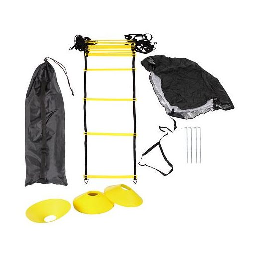 Alapvető edzéskészlet, amely tartalmaz egy agilitási létrát, egy ellenállás-ejtőernyőt futáshoz és 12 padlójelzőt.