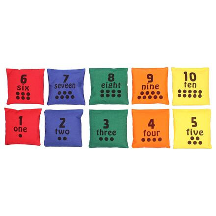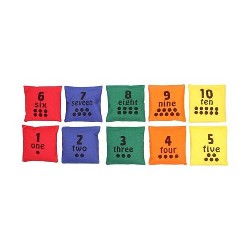 Tíz színes babzsákból álló készlet számokkal, hogy a gyerekek szórakoztató módon tanulhassanak.