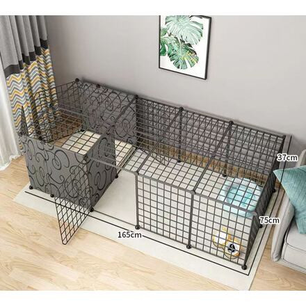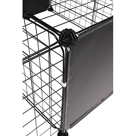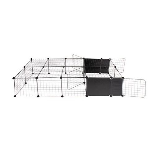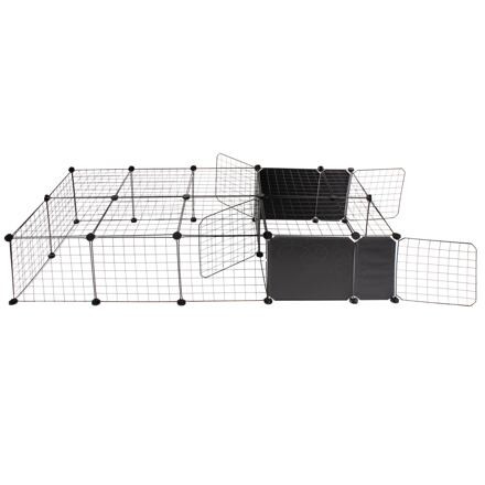 The Merco Block pet fence cage offers for your smaller pets, such as rabbits, puppies or kittens, a pleasant and safe space where they can play and have rest while you keep them under control. Thanks to the top cover, you don't have to worry about the animals climbing over the cage. The pet fence cage designed for indoor use and made of painted steel wire consists of a total of 18 square panels measuring 35 x 35 cm, 4 rectangular panels measuring 17 x 35 cm and 4 panels with doors measuring 35 x 35 cm. With the help of plastic connectors, you can easily connect and combine the parts, exactly according to your ideas. The four doors make it easier to access the enclosure, and the panels with full padding allow you to divide the space even better so that your animals feel as comfortable as possible and have enough privacy. You can assemble the Merco Block pet fence cage easily and quickly according to the instructional video below and according to the attached instructions on the right next to the product description. Dimensions of the sample assembly in the photo gallery using all parts: