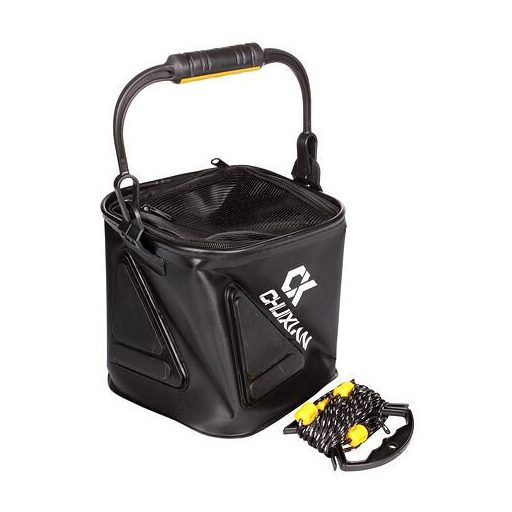 Összecsukható horgászvödör masszív fogantyúval a könnyebb hordozhatóság érdekében. EVA anyagból készült, 5 m-es zsinórral.