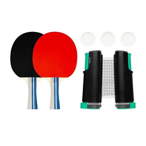 Asztalitenisz szett, amely 2 ütőt, 3 labdát és egy univerzális, állítható hálót tartalmaz. Mindez egy praktikus tokban.