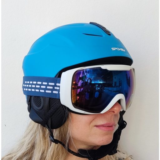 - Fehér síszemüveg keret, kék tükrös lencsével