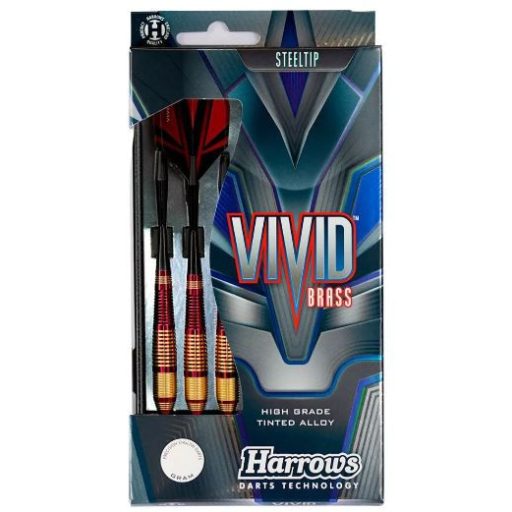 Dart szett Harrows steel 22g Vivid széria egy új fejlesztés eredménye. a sárgaréz testet nitrolakkban áztatják és utána munkálják meg. Ez eredményezi ezt a színösszetételt, ami a Vivid széria sajátja.