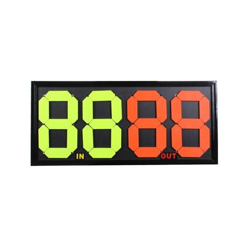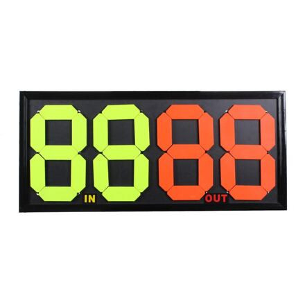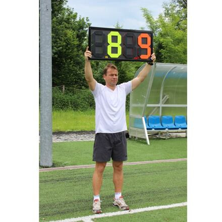 kétoldalas mechanikus cseretábla, a Merco Double nagyon népszerű az edzők és a futballklubok körében. A táblával való kezelés nagyon egyszerű a gumiszalagos rendszernek köszönhetően. Ennek a modellnek az az előnye, hogy mindkét oldalról látható, ki megy be a játékba és ki esik ki. A számok még nagyobb távolságokból is nagyon jól láthatók az élénk sárga és narancssárga színeknek köszönhetően. A tábla méretei körülbelül 84 x 38 x 2 cm. Ez a mechanikus tábla az alapmodellek közé tartozik. Ha professzionálisabb cseretáblát keres, LED-es elektronikus táblákat is kínálunk.