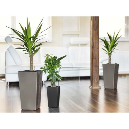 stílusos, díszes, fényes felületű Elise Mat virágcserép ideális kiegészítője otthonának és kertjének. A kivehető tálcás, négyzet alakú virágcserép tömör műanyagból készült, amely fagyálló és UV-stabilizátorral van ellátva, így télen vagy napsütéses nyáron is gond nélkül hagyhatja a kertben. A virágcserép beépített, csavarozható túlfolyóval rendelkezik az esővíz elvezetéséhez. Az Elise Mat 15 modell beépített kanócos öntözőrendszerrel rendelkezik. Az Elise Mat 20 / 25 / 30 modellek Elise Smart System öntözőrendszerrel is megvásárolhatók. A virágcserép minden sarkában kampók találhatók a belső tartály kényelmes kihúzásához. Paraméterek: Elise Mat 15Magasság: 26 cmFelső szél hossza: 14,5 cmÜltetőtér magassága: 15 cmElise Mat 20Magasság: 36,5 cmFelső szél hossza: 19 cmÜltetőtér magassága: 20 cmElise Mat 25Magasság: 46,5 cmFelső szél hossza: 24 cmÜltetőtér magassága: 25 cmElise Mat 30Magasság: 57,5 cmFelső szél hossza: 28,5 cmÜltetőtér magassága: 30 cm