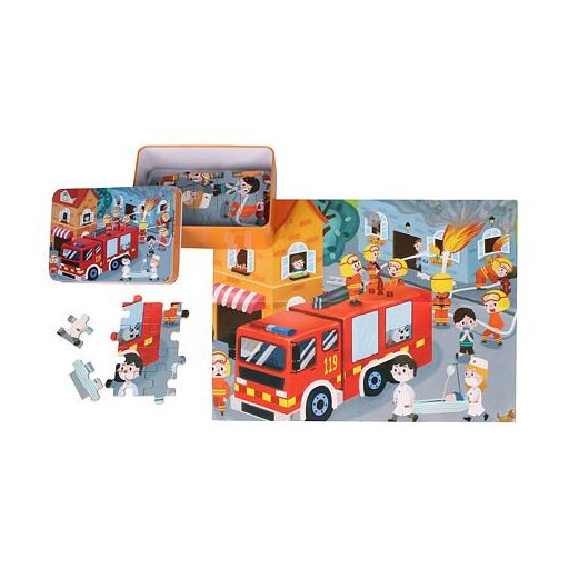 100 darabos, tűzoltóautót ábrázoló fa puzzle gyerekeknek. 3 éves kortól, praktikus fémdobozban.