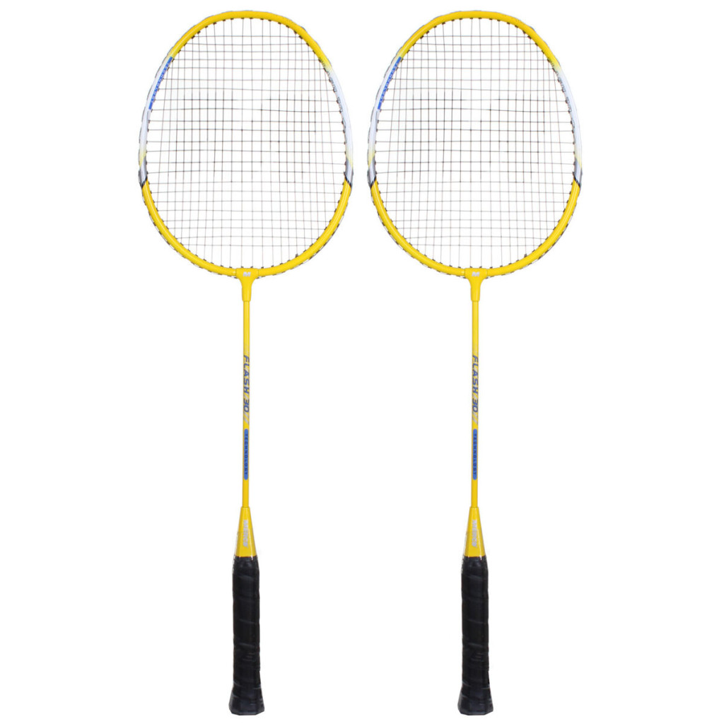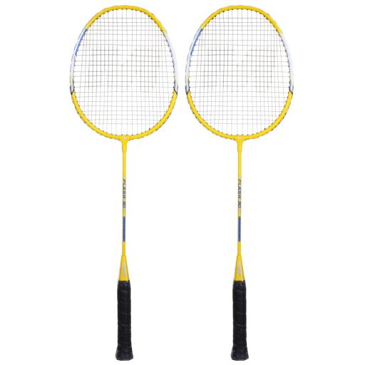 Two lightweight 100g badminton rackets with a graphite neck.- materials (alu graphite composite)- recreational racketThe rackets have already got quality polyester strings.