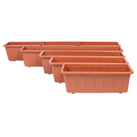 tartós műanyagból készült Garden ablakláda nemcsak kertészkedőknek, hanem mindazoknak is ajánlott, akik egy darab zöld kertet szeretnének vinni erkélyükre vagy teraszukra. A klasszikus ládát többféle hosszúságban és népszerű színváltozatban - barna és terrakotta - kínáljuk. A műanyag láda könnyű, tartósan tartja alakját, és beltéri és kültéri használatra egyaránt alkalmas. A láda aljába vízelvezető lyukakat fúrhatunk a felesleges esővíz elvezetésére. A láda korlátra akasztásához virágcserép tartók beszerzését javasoljuk. Ha a ládát ablakpárkányon, asztalon vagy a padlón helyezzük el, javasoljuk, hogy vásároljunk egy alátétet a Garden ablakládához, amely megtartja a felesleges vizet (ha vízelvezető lyukakat fúrtunk). Paraméterek: Garden 40 Hossz: 39 cm Szélesség: 17 cm Magasság: 15 cm Garden 50 Hossz: 49 cm Szélesség: 17 cm Magasság: 15 cm Garden 60 Hossz: 59 cm Szélesség: 17 cm Magasság: 15 cm Garden 80 Hossz: 78 cm Szélesség: 17 cm Magasság: 15 cm Garden 100 Hossz: 98 cm Szélesség: 18 cm Magasság: 15 cm