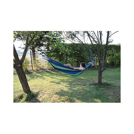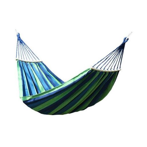 Függőágy a minőségi pihenéshez a kertben vagy a természetben. 100% pamutból készült, támasztókkal, maximum 100 kg-os teherbírással.