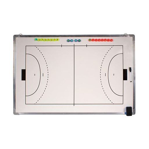 Nagyméretű, függeszthető kézilabda edzőtábla alumínium keretben, praktikus kiegészítő edzők és sportklubok számára. Méretek 90 x 60 cm.