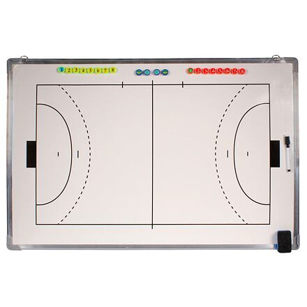 Handball HND01 mágneses edzőtábla minden versenyző kézilabdaklub alapfelszerelése, amellyel bemutathatja és megtervezheti a különböző játékstratégiákat. 8 narancssárga és 8 sárga számozott mágnest, valamint 4 kék mágnest (2 labda motívummal és 2 játékvezető motívummal) fogsz használni. A stratégiai utasítások rajzolásához egy fekete filctollal és szivaccsal ellátott filctollat használsz. A kétoldalas mágneses Handball HND01 tábla, amelynek egyik oldalán a pálya, a másik oldalán a játéktér fele látható fekete-fehér ábrázolással, egy 90 x 60 x 2 cm-es alumínium keretben kapott helyet, súlya pedig 2 kg. A tábla két csúszó kampóval van felszerelve a falra akasztáshoz. A Handball HND01 edzőtáblával mindössze egy briliáns taktikai tervre van szükséged a csapatod számára!