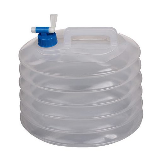A tizenöt literes tartály nemcsak kempingezőknek nagyszerű kütyü. A tartályon található csavaros kupak mellett egy speciális és praktikus csap is található. De a legnagyobb előnye, hogy üresen könnyen összecsukható, és szinte nem foglal helyet. - alsó méretek: hosszúság x szélesség: 31 x 27 cm - teli tartály magassága: kb. 22 cm - űrtartalom: 15 liter