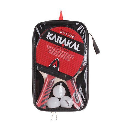 A Karakal KTT-50 asztalitenisz szett két ütőből és három labdából áll. Az ütők nyárfából készültek, homorú fogantyúval, 1,8 mm vastag szivacsborítással és védőgumi bevonattal rendelkeznek. Mindkét ütő és a három labda egy téglalap alakú, cipzáras tokban található. A teljes szett súlya 460 gramm.