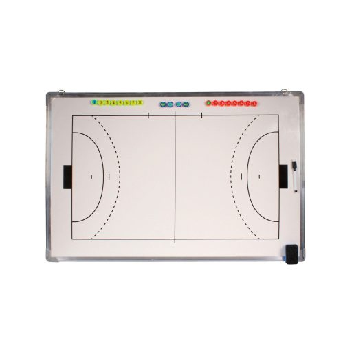 Nagyméretű, függő kézilabda edző taktikai tábla alumínium keretben, praktikus kiegészítő edzőknek és sportkluboknak. Méretei 90 x 60 cm.