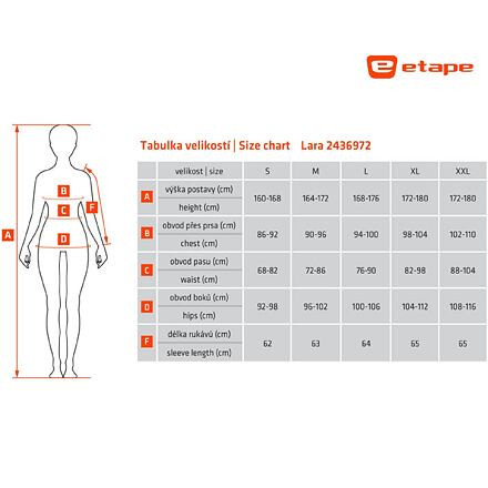 Az ETAPE LARA női pulóver ideális második rétegként sportoláshoz és hétköznapi viselethez, 0 °C és 15 °C közötti külső hőmérsékleten. A felhasznált Velvet Soft és SuperDryntex technológiáknak köszönhetően kellemesen melegen tart, ugyanakkor funkcionálisan elvezeti az izzadságot és a nedvességet a bőrről sporttevékenységek során. A pulóver klasszikus hosszú cipzárral, 3 elülső cipzáras zsebbel és hosszabb cipzárakkal rendelkezik a könnyebb kezelhetőség érdekében. Velvet Soft - szintetikus hőszigetelő anyag, amely kiváló második rétegként. Az anyag nagyon kellemes tapintású és magas hőtartást biztosít. A magas szőrzetnek köszönhetően szigetelő réteget is képez a bennragadt levegő ellen, így megakadályozza a test nem kívánt lehűlését. SuperDryntex - funkcionális, elasztikus anyag poliészter mikroszálakból, amely nagyon gyorsan szárad, elvezeti az izzadságot és a nedvességet a bőrről. Antibakteriális kezelésének és foltállóságának köszönhetően nagyon könnyen karbantartható. Az anyag különböző súlyai ​​eltérő hőszigetelő tulajdonságokat kínálnak. - anyag: 100% poliészter - 30°C-on mosható, nem fehéríthető, nem vasalható, nem vegytisztítható, ne használjon öblítőt Mérettáblázat a képeken. A megadott értékek tájékoztató jellegűek, a megfelelő méret az adott figurától függően eltérhet.