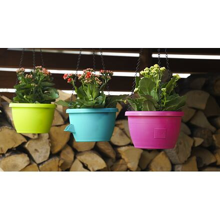 Műanyag függő virágcserép, amely alkalmas lakásba, erkélyre, kerti pavilonba és pergolába.