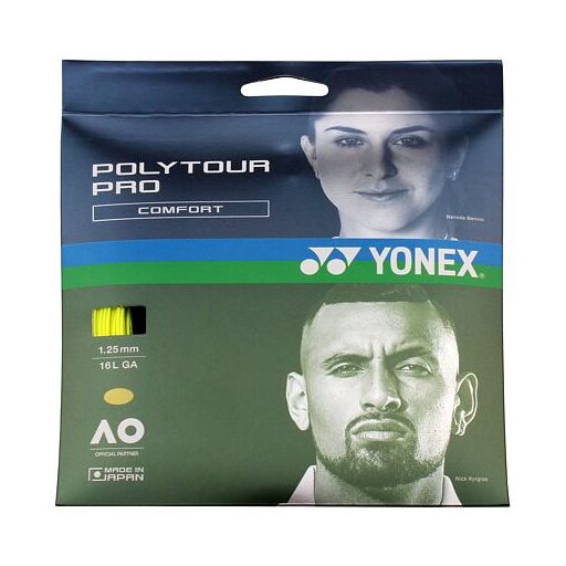 A Yonex Poly Tour Pro teniszhúr monofil maggal rendelkezik, poliészter-polimer jellemzőkkel. Ez a húr a profi játékosok népszerű választása. Ez az a húr, amire szükséged van a maximális pörgéshez, erőhöz és kontrollhoz. Átmérő: 1,25 mm.