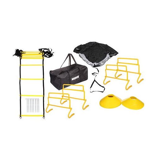Alapvető edzéskészlet, amely tartalmaz egy agility létrát, ellenállás-csúszdát, 12 talajjelzőt és 4 gátat.