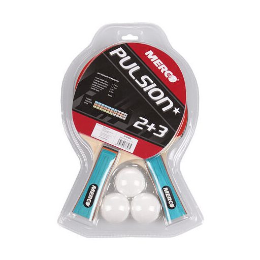 Merco Pulsion* asztalitenisz szett két Pulsion* asztalitenisz ütőt és három Popular edzőlabdát tartalmaz. Ez a szett elsősorban kezdő és hobbi játékosok számára alkalmas, akik elsajátítják az alapvető ütéseket és technikákat. Árának köszönhetően iskolák számára is alkalmas. Az ütők olyan anyagokból – 5 rétegű fa, PU hab és gumi – készültek, amelyek garantálják a jó tartósságot. Paraméterek: Teljesítmény (sebesség) 7/10, Irányítás 9/10, Pörgés 6/10. A Popular műanyag labdák fehér színben, logó nélkül készülnek, klasszikus átmérőjük 40 mm. A szett méretei 31 x 20 x 5 cm, súlya 370 g.