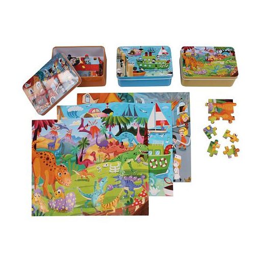 Puzzle Set Boy szett dinoszaurusz, tűzoltóautó és gőzhajó modelleket tartalmaz. A Merco gyermek kirakó segít a gyerekeknek fejleszteni a logikus gondolkodást és a kézügyességet. Ezek a kirakók 100 darabból állnak, és összerakva a kép mérete körülbelül 28,5 x 22,5 cm. Ezenkívül az egyes részek a másik oldalon számozottak az összeszerelés megkönnyítése érdekében. A kirakók praktikus fémdobozban vannak csomagolva a könnyű tárolás érdekében. - készlet: 3 különböző modell - 1 készlet: 100 darab - méretek összecsukás után: 28,5 x 22,5 cm - a doboz méretei: 14 x 9 x 5 cm - A termék nem alkalmas 3 év alatti gyermekek számára!