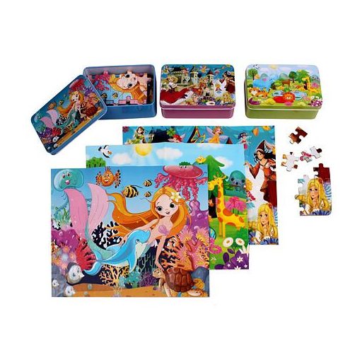 Lányos Puzzle készlet Sellő, Hercegnő és Erdei állatok modelleket tartalmaz. A Merco gyermek kirakó segít a gyerekeknek a logikus gondolkodás és a kézügyesség fejlesztésében. Ezek a kirakók 100 darabból állnak, és összerakva a kép mérete körülbelül 28,5 x 22,5 cm. Ezenkívül az egyes részek a másik oldalon számozottak az összeszerelés megkönnyítése érdekében. A kirakók praktikus fémdobozban vannak csomagolva a könnyű tárolás érdekében. - készlet: 3 különböző modell - 1 készlet: 100 darab - méretek összecsukva: 28,5 x 22,5 cm - a doboz méretei: 14 x 9 x 5 cm - A termék nem alkalmas 3 év alatti gyermekek számára!