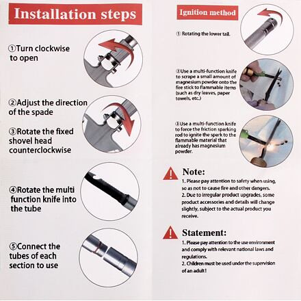 Akár természetjárásra, hosszabb kempingezésre a vadonban, nyári gyermektáborozásra vagy esetleg horgászatra indulsz, a Merco Scout Extra multifunkcionális összecsukható lapát jó szolgálatot tesz majd. A lapát rozsdamentes acélból készült, így nagyon strapabíró, ugyanakkor kihajtva minimális helyet foglal, és könnyen becsomagolhatod akár egy kisebb hátizsákba is. Súlya csomagolással együtt mindössze 990 g. Az egyes funkciók meglepnek és izgalomba hoznak. A klasszikus lapát vagy ásó funkció mellett, amelynek maximális nyélhossza 68 cm, a lapátot kapaként is használhatod a nyél menetének meglazításával és a fej 90 fokkal történő elforgatásával. A fej egyik oldalán található recézettségnek és a másik oldalon lévő csiszolt élnek köszönhetően a lapát fűrészként vagy húsvágóként is használható. A lapát fején lévő kivágás üveg- vagy konzervnyitóként szolgál. A nyél 4 részből áll, amelyeket könnyen és szorosan összecsavarozhatsz. A nyél különálló részéhez egy fűrésszel és nyitóval ellátott multifunkcionális kés van csavarozva. Amikor a kés nincs használatban, biztonsági okokból egyszerűen elrejtheted a lapátnyél másik részébe csavarozva. A nyél vége hegyes acélheggyel van ellátva, amellyel például üveget, jeget vagy más vékonyabb és törékenyebb anyagokat törhetsz. A vége lecsavarása után egy hosszabbítót találsz síppal és egy rövid pálcát kis mennyiségű magnéziumporral. Ha ezt a pálcát a kés pengéjéhez dörzsölöd, a meggyújtott szikráknak köszönhetően vésztüzet rakhatsz. A csomag tartalmaz egy textil huzatot a lapátfejhez és egy poliészter tokot a nyél két részéhez és a késhez. A Merco Scout Extra összecsukható lapáttal nem kell aggódnod a természetben való tartózkodás buktatói miatt. A Merco Scout Extra lapát jellemzői: - állítható nyélhosszúságú lapát vagy ásó - fűrész - aprító - kapa - nyitó - kés fűrésszel és nyitóval - síp - kalapács hegygel törékeny anyagok aprításához - kovakő tűzgyújtáshoz A csomag tartalma és paraméterei: - 1 x lapátfej csavaros véggel (fej mérete: hosszúság x szélesség: 17 x 13 cm). - 4 x nyél csavarozható része (1 rész hossza: 18 cm, átmérő: 27 mm). - Összecsukható nyél maximális hossza: 68 cm - 1 x csavaros tartozék multifunkciós késsel. - 1 x csavaros hegy heggyel. - 1 x síp. - 1 x magnéziumporral dúsított pálca (hossz 32 mm), kovakőként szolgál tűzgyújtáshoz. - 1 x pengefej tok. - 1 x tok a nyél 2 részéhez és a késhez (szélesség x hosszúság: 13 x 23 cm). - Anyag: rozsdamentes acél, poliészter. - Az összes alkatrész össztömege, beleértve a tokokat is: 990 g - Csomag mérete: 26 x 15 x 5 cm