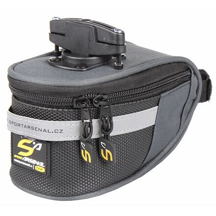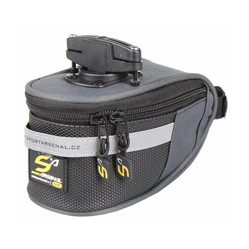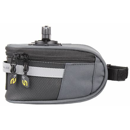 Közepes méretű, masszív nyeregtáska, 17 x 9 x 9 cm, vízálló anyagból. Gyorsrögzítővel rögzíthető.