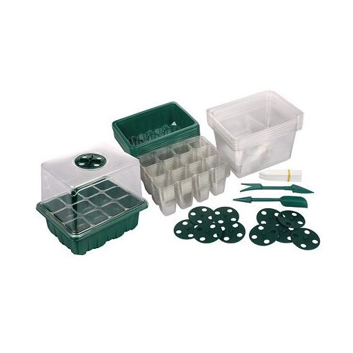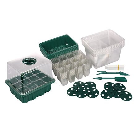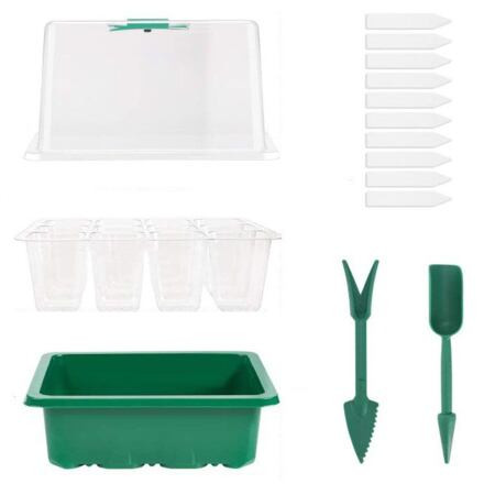 Kis műanyag üvegház palánták előneveléséhez, vágott növényekhez és magok csíráztatásához. Egy darab 12 lyukat tartalmaz a palántáknak, a teljes készlet pedig 10 mini virágtartótálcát tartalmaz.