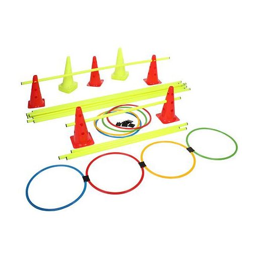 Multifunkcionális agility akadálykészlet edzéshez. 18 bója, 13 rúd és 8 kör. Praktikus táskával.