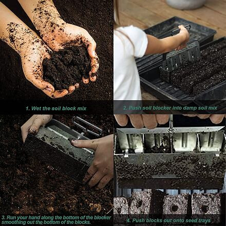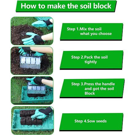 Talajtömbölő 4 db 5,1 x 5,1 x 6,1 cm-es talajtömb készítéséhez növényi magvak ültetéséhez vagy átültetéséhez. Horganyzott acélból készült, csúszásmentes fogantyúval.