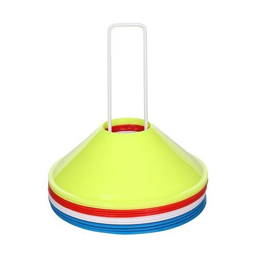 Marker Discs Space are made of plastic material that is durable and resistant to damage. The are perfectly visible thanks to used colors. These discs serve as an aid for agility and fitness training. They can be used indoor and outdoor. The set includes one stand (plastic or metal) with 16 discs in four different colors. The height of disc is 50 mm and a diameter of 190 mm.