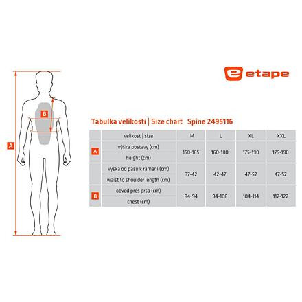 Az Etape SPINE hátvédő tökéletesen illeszkedik a testhez, így maximális kényelmet és biztonságot nyújt minden téli sportok rajongójának, akik minőségi védelmet keresnek, miközben a kényelmet is hangsúlyozzák. Az EN 1621-2 európai szabvány szerinti jóváhagyás garantálja a maximális biztonságot. A gerincvédő felszerelés tartalmaz egy 4 rétegű ERGOFLEX 4X™ nedvszívó habot a maximális védelem érdekében, 3D szellőzőanyagot a háton az ideális kényelem érdekében, anatómiai formát, állítható anatómiai pántokat és állítható rugalmas derékot. GERINC: - megfelel a ČSN EN 1621-2 szabvány 1. osztályának - ERGOFLEX 4X™ 4 rétegű nedvszívó hab a maximális védelemért - 3D szellőzőanyag a háton az ideális kényelemért - anatómiai forma és állítható anatómiai pántok - rugalmas anyagból készült a tökéletes kényelemért - állítható rugalmas derékpánt - Velcro Safe™ rögzítéssel = 100%-os ruházatvédelem Méretek / testmagasság: S (150-175 cm), M (170-180 cm), L (175-185 cm), XL (185-195 cm) Anyag: 55% habszivacs, 22% poliészter, 20% poliamid, 3% egyéb. Ápolás: kézzel mosható hideg vízben, teregetve szárítandó, ne szárítsa szárítógépben, ne használjon öblítőt, ne fehérítse, ne vasalja, ne vegytisztítsa.