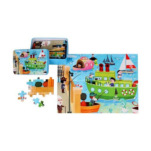 100 darabos, fából készült gyerekpuzzle gőzölő képével. 3 éves kortól, praktikus fémdobozban.