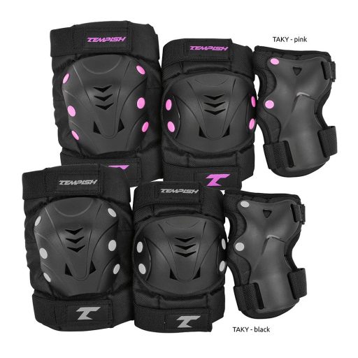 TEMPISH TAKY set of 3 protectors for skaters provide safe protection of the main parts of the human body where the injuries are most frequent (except head - helmet). The set consists of a wrist, knee and elbow protector. The wrist protector has a plastic padding that protects the wrist from inside against injuries. The inner part of all the protectors is made of soft fabric, which absorbs well the moisture (sweat) and gently glides over the skin. The wrist protector is firmly fastened by thinner strap on the palm and a wider strap on the wrist with a TEMPISH logo. The plastic shell of the knee and elbow protectors is very strong and has a perfect anatomical shape to ensure a stable position of the protector, comfortable while skateboarding and moving, and a high level of fall protection. The textile part of the protector is firmly attached to 3 rivet pairs. The texture part of the protector consists of three parts: the first part is attached by elsastic strap above the joint and moves along with it.