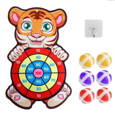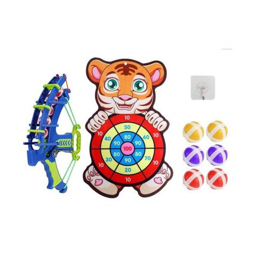 Műanyag gömbíj tépőzárral, tigris alakú céltáblával és akasztóval.