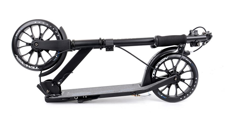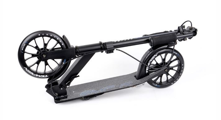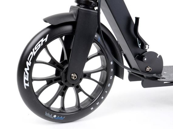 TEMPISH SMF 200 összecsukható roller kézifékkel. A hátsó kerékfék a kormányon lévő jobb kézzel működtethető. A roller nagyon kényelmes összecsukható rendszerrel rendelkezik. A fogantyúk egy nagyon szoros bilinccsel vannak rögzítve közvetlenül a kormányrúdon. A fogantyúkon habszivacs markolat található. A kormány magassága állítható és gyorscsatlakozóval rögzíthető. Az alap futófelület le van engedve a kényelmesebb és hosszabb gurulás érdekében. A roller masszív sárvédő/hátsó kerékfékkel is fékezhető. A parkoláshoz sztenderrel van felszerelve.
