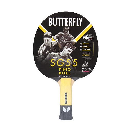 Butterfly Timo Boll asztalitenisz ütő szériáját a legjobb kortárs európai játékosról nevezték el. A Timo Boll SG55 modellt haladó játékosok számára tervezték, akik arra törekszenek, hogy képességeiket a „Boll-szintre” emeljék, és a nagyszerű Timo-hoz hasonlóan a legjobb eredményeket érjék el. Ha úgy szeretnél játszani, mint egy bajnok, elengedhetetlen a megfelelő felszerelés, valamint a tökéletes technika és a villámgyors támadó ütések elsajátítása. A Timo Boll SG55 modell 1,5 mm-es szivacsréteggel és anatómiailag formázott nyéllel rendelkezik, amely ebben segíthet. Az ütő nyélének közepén található bevágás jelentősen leegyszerűsíti a fogást. Az egyedi nyélforma minimalizálja az ujjak csúszását, és javítja a fogást a tenyérrel. A Timo Boll SG55 asztalitenisz ütő megbízható eszköz azok számára, akik a bajnok csodálói, és szeretnének úgy játszani, mint ő, vagy egy napon ellene.