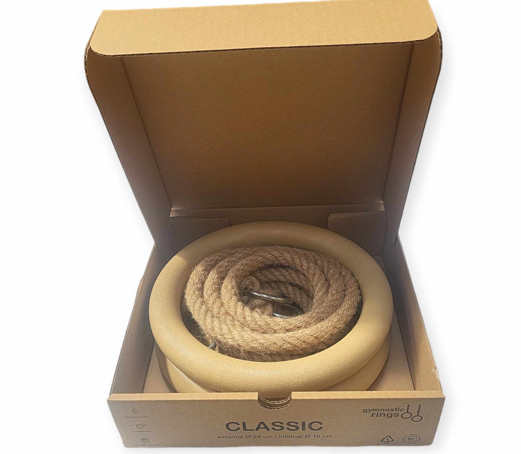 Állítható magasságú, műanyag szálas kötéllel ellátott tornászgyűrű.