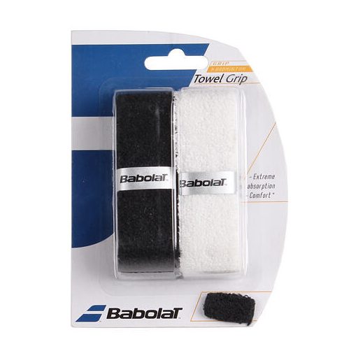 Babolat Towel Grip egy rendkívül nedvszívó frottír törölköző, amely alkalmas az ütős sportok kedvelőinek, akik játék közben sokat izzadnak. A csomag 2 db 100% pamutból készült törölközőt tartalmaz - fekete és fehér. A markolat hossza 75 cm, szélessége 30 mm, vastagsága 2,45 mm és súlya 19 g.