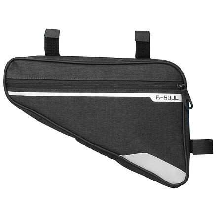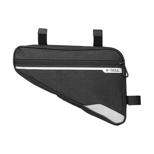 B-SOUL Triangle 2.0 kerékpár váztáska egyszerű és sok éve bevált kialakítással rendelkezik. A táska elég nagy ahhoz, hogy személyes holmikat tároljon benne, ugyanakkor elég kicsi ahhoz, hogy megakadályozza a lábak ütődését kerékpározás közben. A Triangle 2.0 táska egy cipzáras rekesszel és egy külső hálós zsebbel rendelkezik, gyors hozzáféréssel. Elegendő helyet biztosít kulcsoknak, pénztárcának, de kerékpáros kesztyűknek vagy alapvető javítókészletnek is. Alakjának köszönhetően minimalizálja a szélállóságot. A Triangle 2.0 táska tömör poliészter anyagból készült, belső PU borítással, hogy megvédje a tartalmát a túlzott nedvességtől eső esetén. A táska méretei 34 x 29 x 20 x 5 cm, térfogata közel 1,5 liter. Könnyen felszerelhető. Csak rögzítsen három tépőzáras pántot a kerékpár szerkezetéhez, és kész is. A B-SOUL modern kerékpáros felszerelése kényelmesebbé teszi a kerékpáros túrákat.