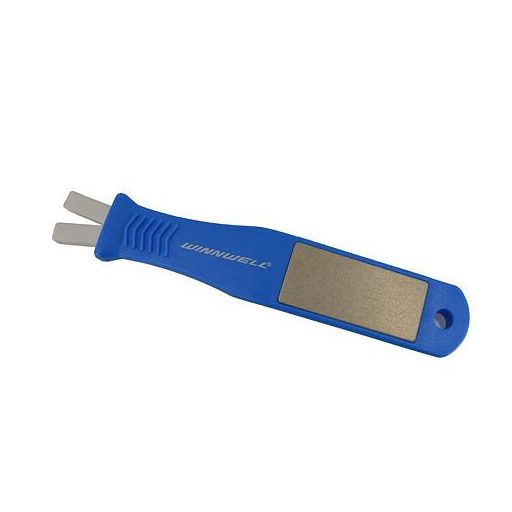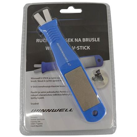 A Winnwell V-STICK egy kézi korcsolyaélező eszköz. Segít az élek helyreállításában és a sorják eltávolításában. Könnyen használható. Fogja meg erősen a V-STICK-et, és húzza végig finoman a pengén a lábujjaktól a sarokig. A V-STICK nem helyettesíti a hagyományos élezést!