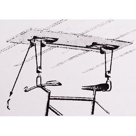 Kerékpártartó szűkös helyekre. Jellemzők: a tartót a mennyezetre kell rögzíteni (csak csavarok mellékelve), ideális pincébe, téglamennyezetes garázsba, egyszerű rögzítés és kezelés, nem igényel nagy erőt, görgős rögzítő mechanizmussal, maximális teherbírás 22 kg.