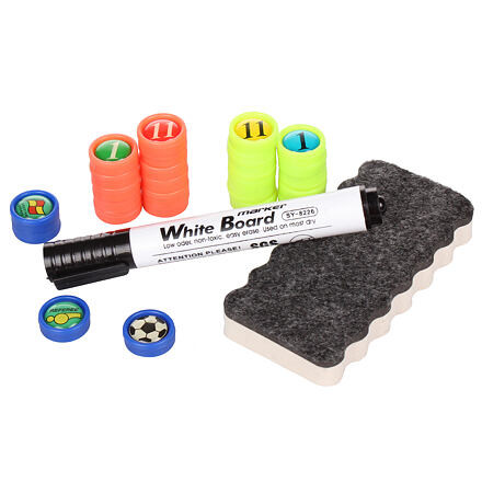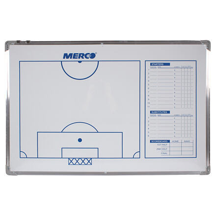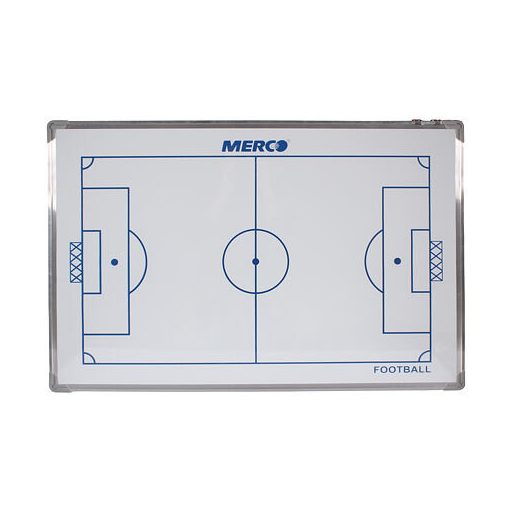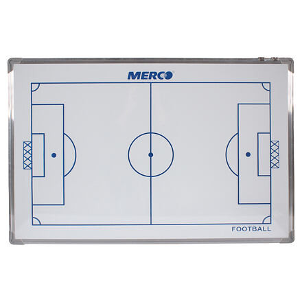 Egy futballedző tábla hasznos eszköz minden futballedző számára, minden versenykategóriában. A Merco Football 90 taktikai tábla egy mágneses tábla, két mágneskészlettel a mérkőzés megtervezéséhez és a teljesítmény elemzéséhez. A kétoldalas edzőtábla egyik oldalán egy futballpálya látható. A másik oldalon a futballpálya fele és a játékosok menetrendje látható. A Merco Football 90 két készlet számozott mágnest (1-11) és négy másik mágnest tartalmaz, amelyek a labdát és a játékvezetőt jelképezik, valamint egy fekete filctollat és egy radírt a játékstratégia leírásához. Alumínium keretben található, méretei 90 x 60 x 2 cm, súlya pedig kb. 2 kg. A tetején két kampó található, hogy szükség esetén a falra akaszthassa. Magyarázd el hatékonyan a szükséges utasításokat a játékosoknak a mérkőzés során a Football 90 taktikai táblának köszönhetően.
