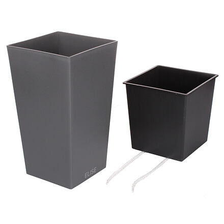 stílusos, díszes, fényes felületű Elise Mat virágcserép ideális kiegészítője otthonának és kertjének. A kivehető tálcás, négyzet alakú virágcserép tömör műanyagból készült, amely fagyálló és UV-stabilizátorral van ellátva, így télen vagy napsütéses nyáron is gond nélkül hagyhatja a kertben. A virágcserép beépített, csavarozható túlfolyóval rendelkezik az esővíz elvezetéséhez. Az Elise Mat 15 modell beépített kanócos öntözőrendszerrel rendelkezik. Az Elise Mat 20 / 25 / 30 modellek Elise Smart System öntözőrendszerrel is megvásárolhatók. A virágcserép minden sarkában kampók találhatók a belső tartály kényelmes kihúzásához. Paraméterek: Elise Mat 15Magasság: 26 cmFelső szél hossza: 14,5 cmÜltetőtér magassága: 15 cmElise Mat 20Magasság: 36,5 cmFelső szél hossza: 19 cmÜltetőtér magassága: 20 cmElise Mat 25Magasság: 46,5 cmFelső szél hossza: 24 cmÜltetőtér magassága: 25 cmElise Mat 30Magasság: 57,5 cmFelső szél hossza: 28,5 cmÜltetőtér magassága: 30 cm